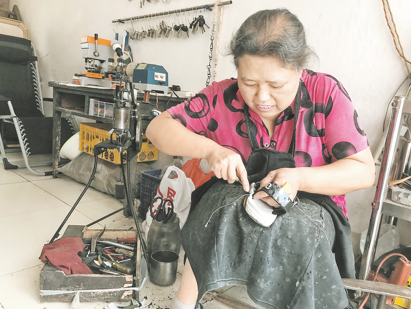 7月2日,空气中弥漫着湿热。在市区东背街的修鞋店里,王敏正专注地为手中的鞋子粘底,即使头顶的风扇在不停转动,可没一会儿,王敏额前的碎发还是被汗水打湿,旁边的两三名顾客一边等待,一边摆手为自己扇凉。