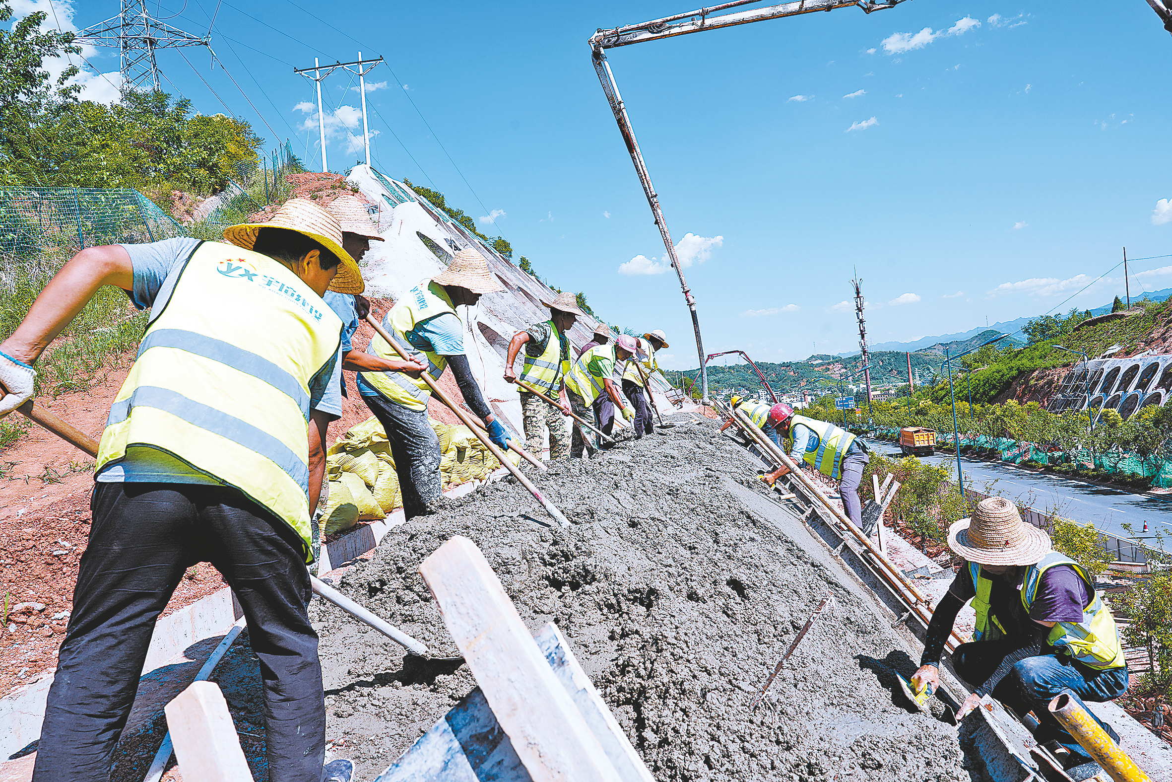 北环滑坡体治理工程现场,施工人员战高温、斗酷暑,保障项目建设顺利推进。