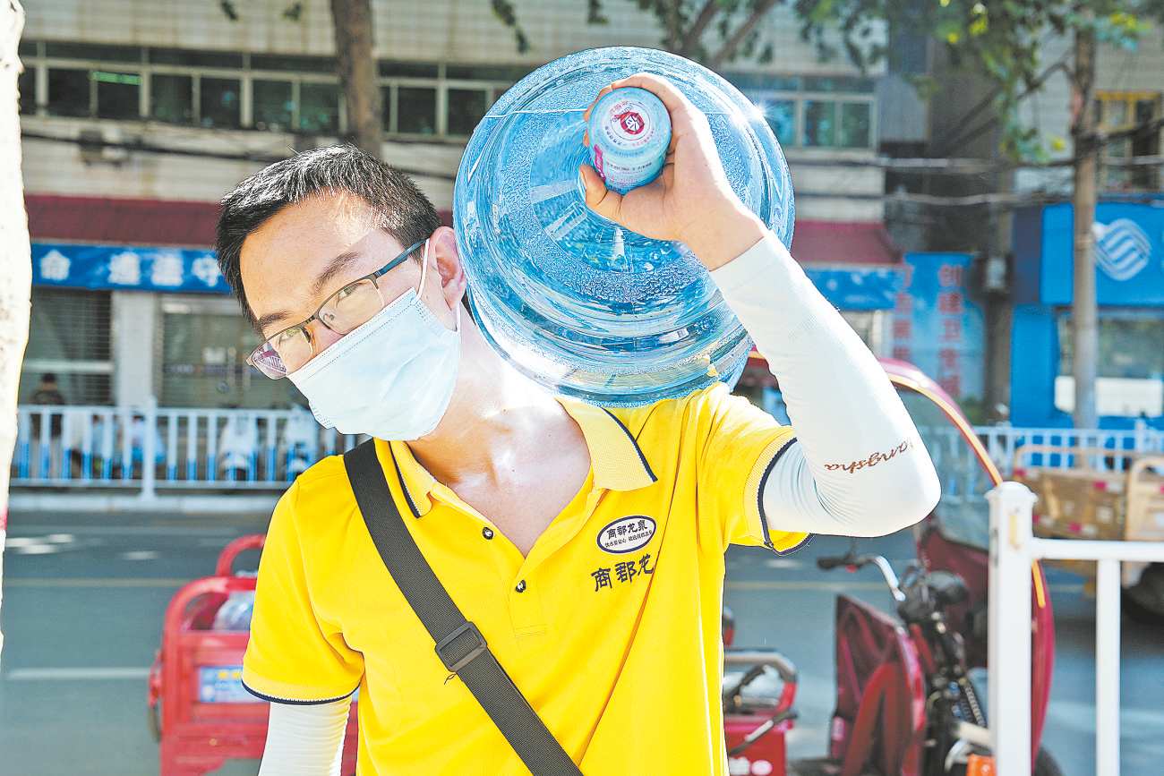 送水工王鹏飞扛着水桶上楼又下楼运送“甘露”,汗水湿透了他的每一寸衣裳。
