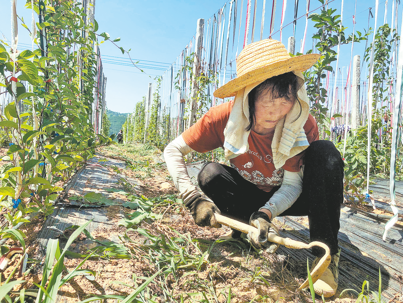 洛南县保安镇黑潭村村民唐春凤在五味子基地干农活
