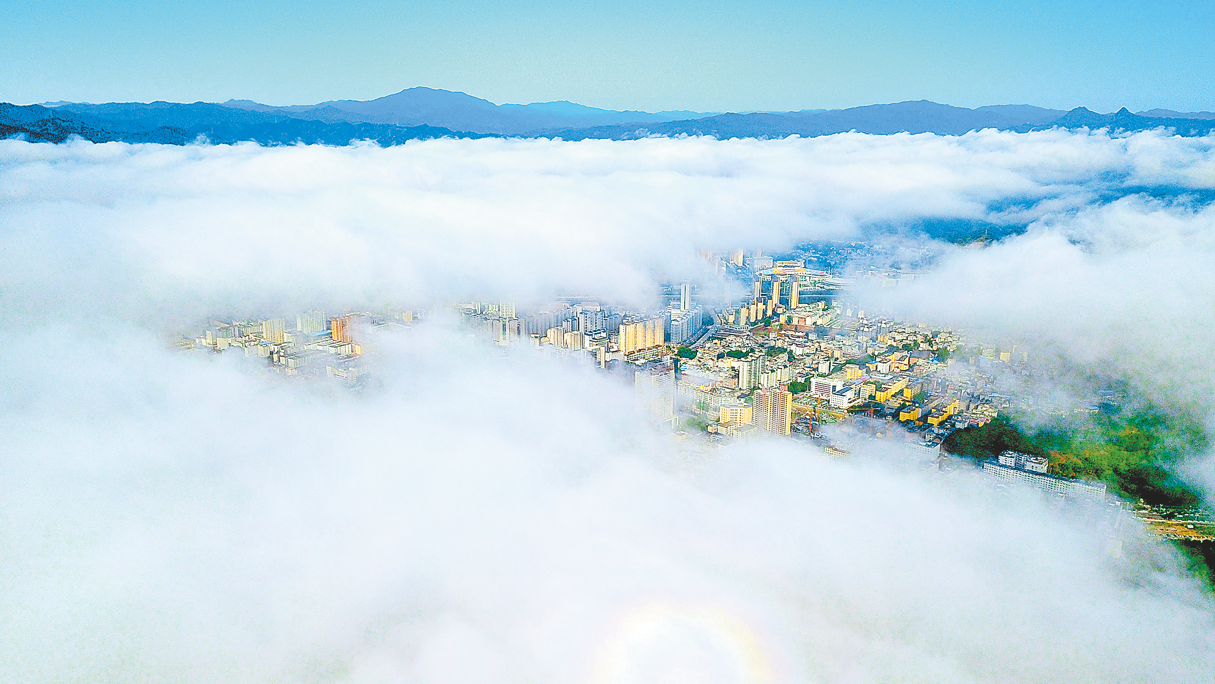 成片的白色云团飘过山顶,一会儿像瀑布倾泻而下,一会儿像围巾环绕山峰,一会儿又像薄纱轻抚绿色田野。当站在商州的戴云山、熊耳山山顶举目四望,只见城市和群山淹没在云海里,红日镶嵌在尽头,一望无垠,甚为壮观。连日来,商州戴云山、熊耳山的浩瀚云海、壮美奇观在各个媒体平台被刷屏,吸引了大批市民争相前往观赏。