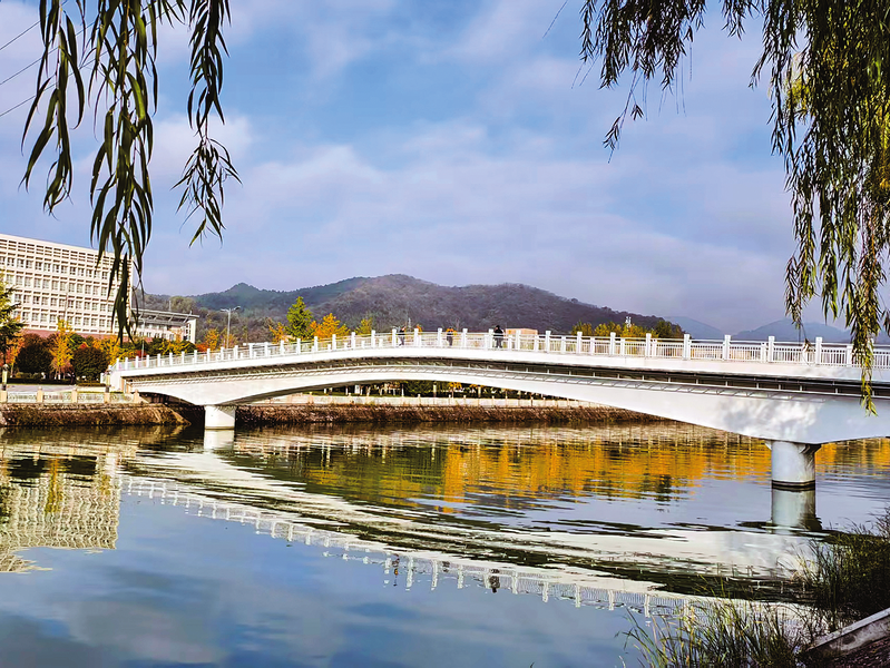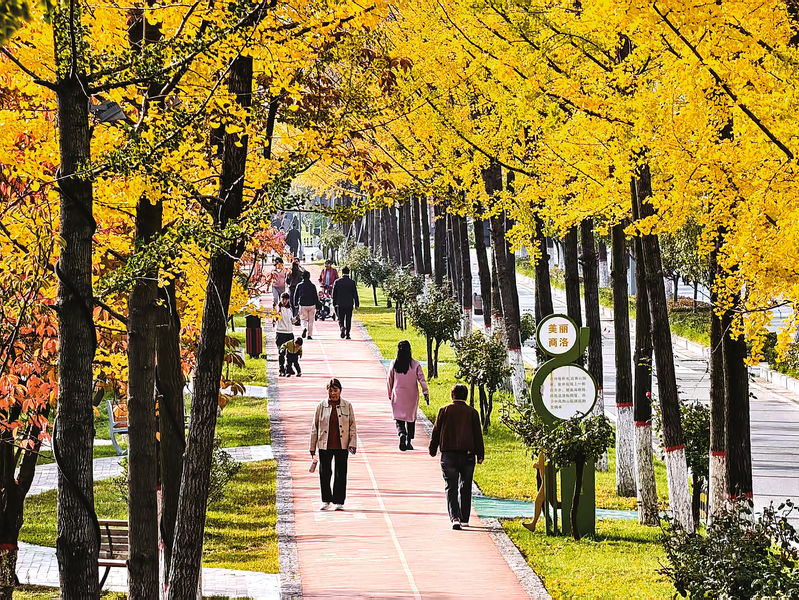 △在市区丹江公园,碧蓝而高远的天空、白色的桥和金色的银杏叶倒映在清澈的河水中,如同一幅秋日油画。 ▷市区滨江银杏公园内,市民在高大的银杏树间散步,尽显秋日的惬意。