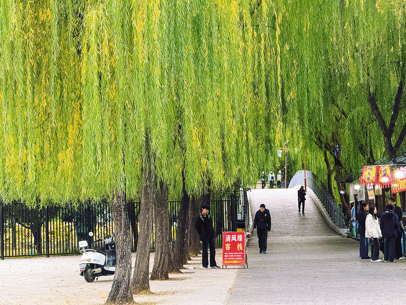 在丹凤县棣花古镇,柳枝翠绿中夹杂着金黄,如美女柔顺的发丝千万条垂下,别具一种秋日的美。