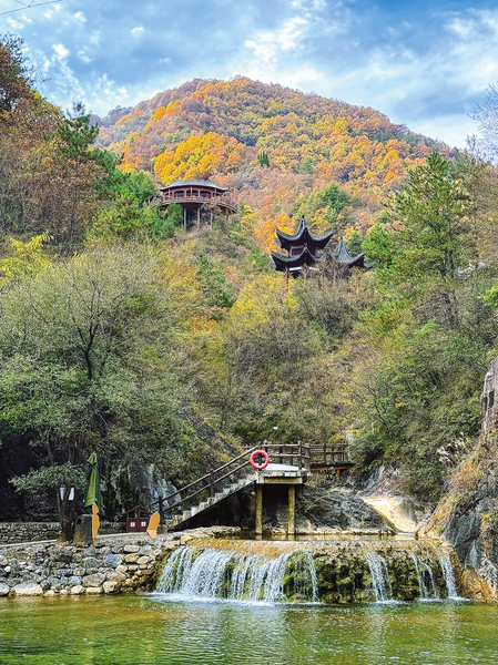 ▷在秦岭江山景区,飞檐翘角的亭子掩映在碧水、蓝天和斑斓的山色中,共同构成了一幅秋日盛景。
