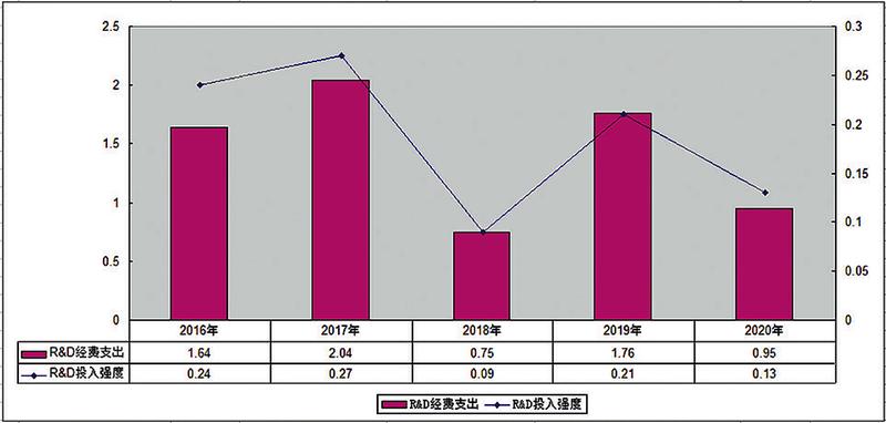 2020年,我市全社会科技与研发经费支出0.95亿元,比上年减少0.81亿元,同比下降46%;科技与研发经费投入强度为0.13%,比上年减少0.08个百分点。无论是科技与研发经费支出,还是投入强度都处于近年来的低位。商洛市2016—2020年科技与研发(R&D)活动情况