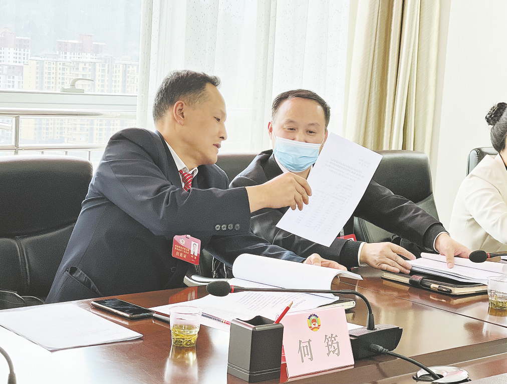 3月26日,何筠、成小斌委员一起讨论政协工作报告和提案工作报告。他们表示,报告定位准确、层次清晰、鼓舞人心。(本报记者 方 方 摄)