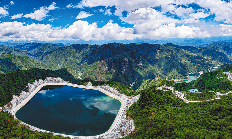 蓝天白云下的镇安抽水蓄能电站上水库,在葱郁的青山间十分壮观,一幅“高峡出平湖、绿水绕青山”的画卷徐徐展开。(本报通讯员 倪方海 摄)