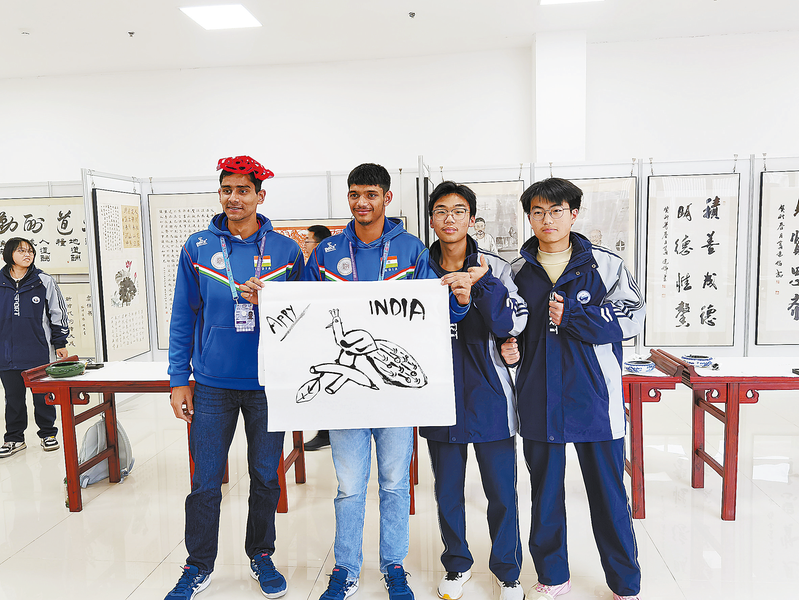 12月9日,印度队员走进商洛中学,用毛笔画下印度国鸟——蓝孔雀,定格中外少年的暖心情谊。 (本报记者 景 康 摄)