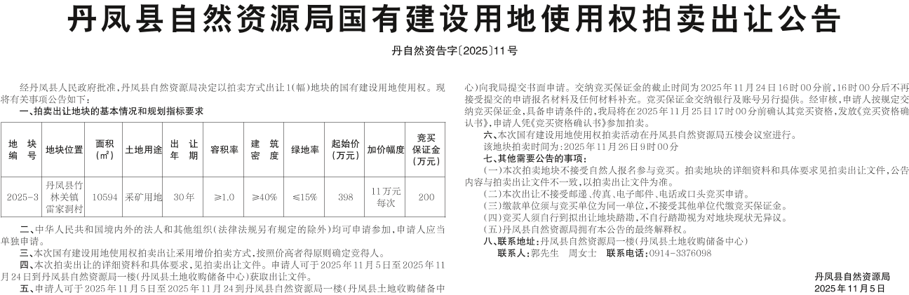 丹凤县自然资源局国有建设用地使用权拍卖出让公告