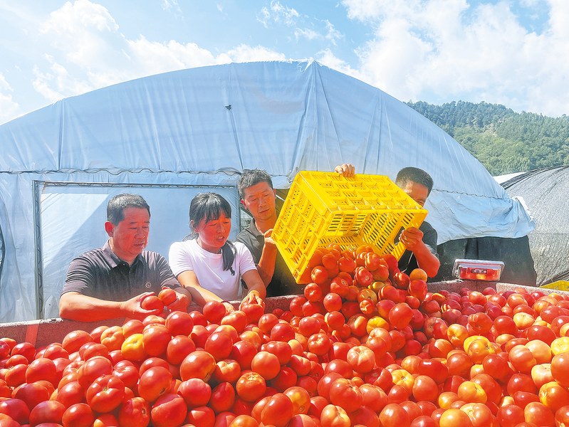 ◁放心菜种植基地外,工人把刚采摘的西红柿集中装车。