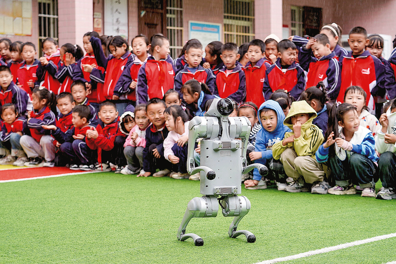 在寺耳镇中心小学,智能机器狗的倒立表演吸引了同学们围观。