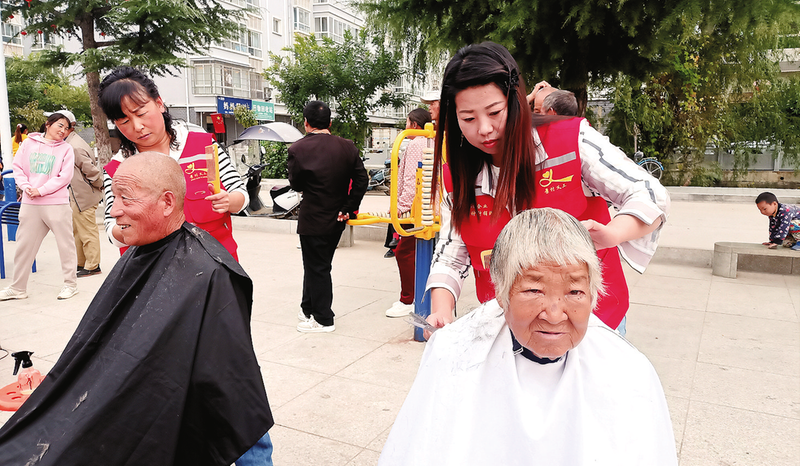 近日,志愿者在景村街社区广场开展孝德实践活动,为辖区老人义务理发。