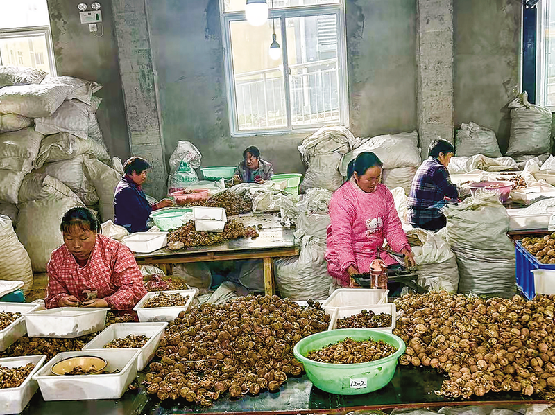 在初加工区,工人正在对核桃进行精细分拣。来自洛源街社区的张彩云手指翻飞,熟练地将核桃按品级分装。“在这里上班,既学到了技术,又能照顾家里,别提心里有多美了。”她笑着说。这个建在群众家门口的加工点,目前已稳定带动60多名当地群众实现就业增收。