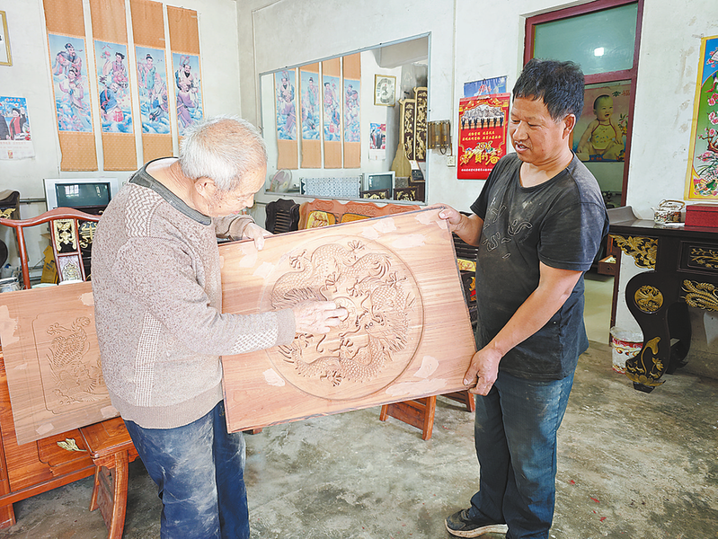 10月9日,党继生(左)展示儿子党军华雕刻的《二龙戏珠》。