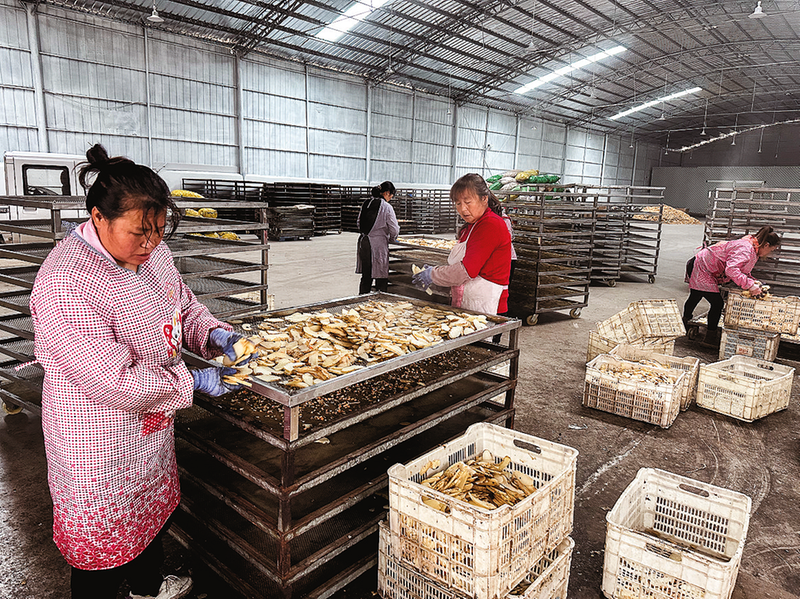 传明中药材种植农民专业合作社的天麻切片加工厂内,工人正在晾晒天麻。