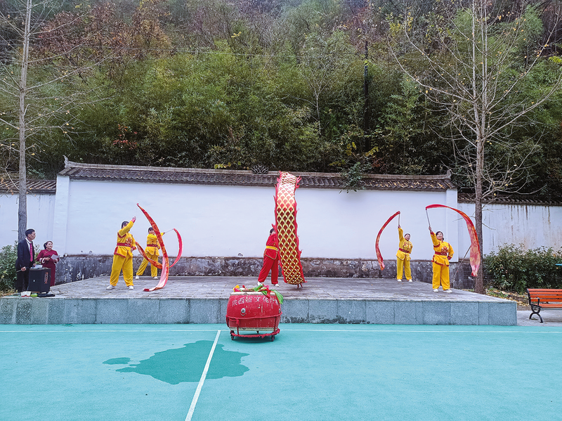 傍晚时分,太子坪村村民在文化大舞台上排练节目。红黄戏服伴着锣鼓声声,尽显乡土活力。