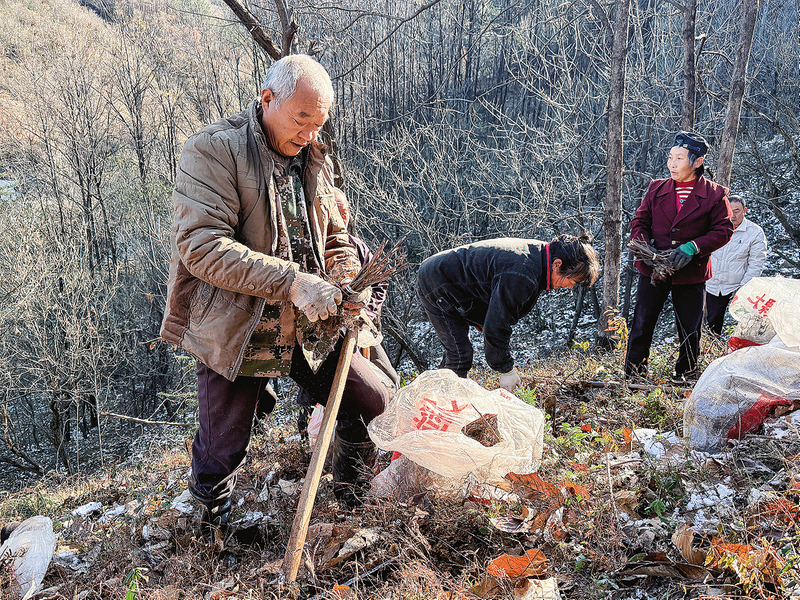 11月19日,商南县富水镇黄土凸村的山垄间,初雪未融,山风裹着几分凛冽,却挡不住林地阴坡上的热闹。一群村民手持锄头、提着鼓囊囊的小通草树苗袋,弯腰、刨坑、放苗、培土,动作娴熟利落。新栽的幼苗在残雪映衬下,透着勃勃生机。这是黄土凸村种下小通草的第二年,也是这个藏在深山里的村落挣脱“增收难”枷锁、改写发展轨迹的关键契机。