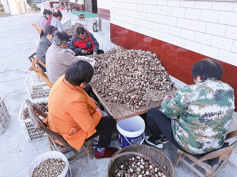 11月19日,村民正在加工(剪菌柄)、分拣刚采收回来的香菇。