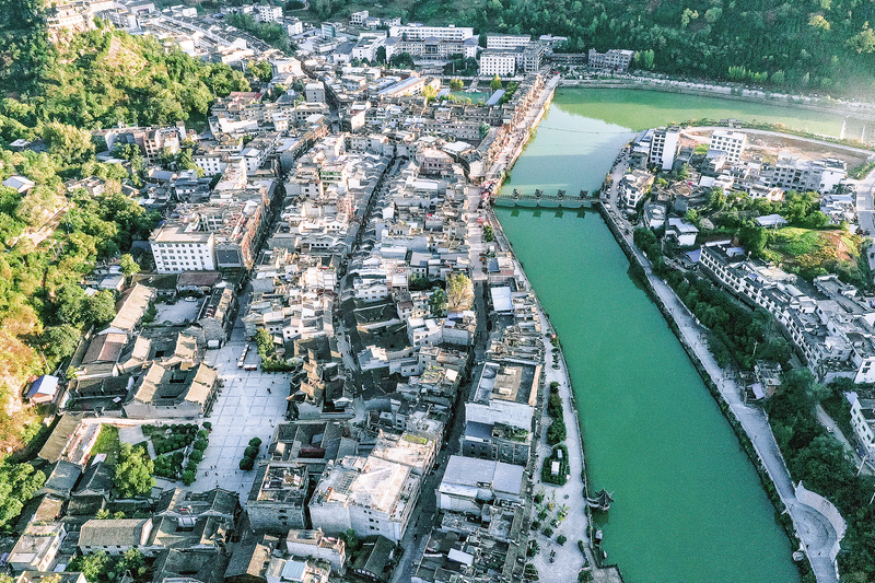 △漫川古镇古建筑群与青山绿水相映成趣,构就一幅美丽的山水画卷。