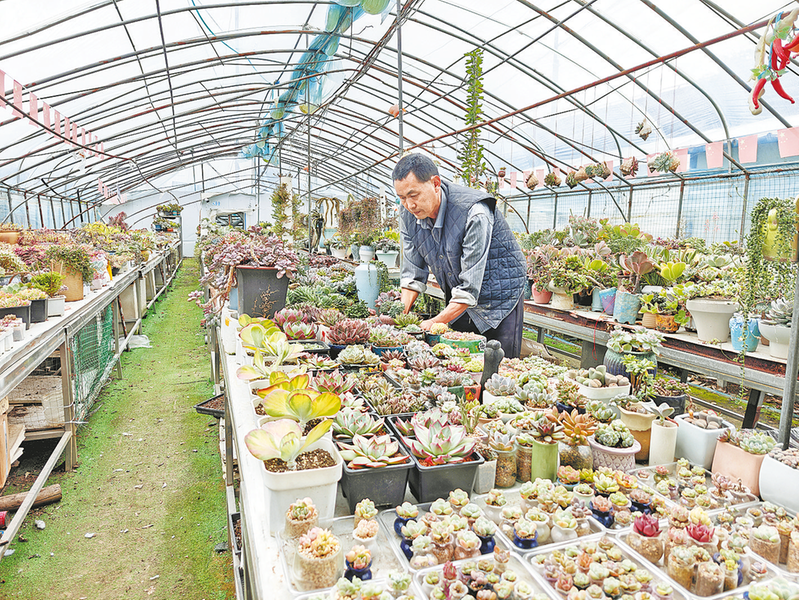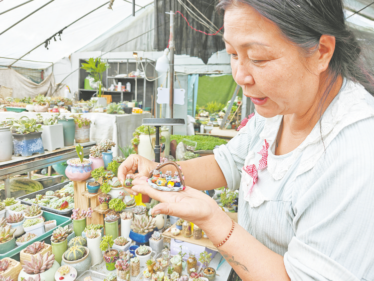 △刘瑞正在精心打理多肉植物。
