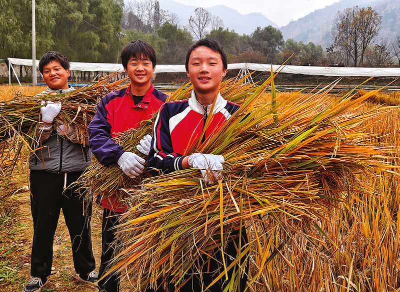 三岔河九年制学校的孩子们第一次体验收割稻谷,收获满满。