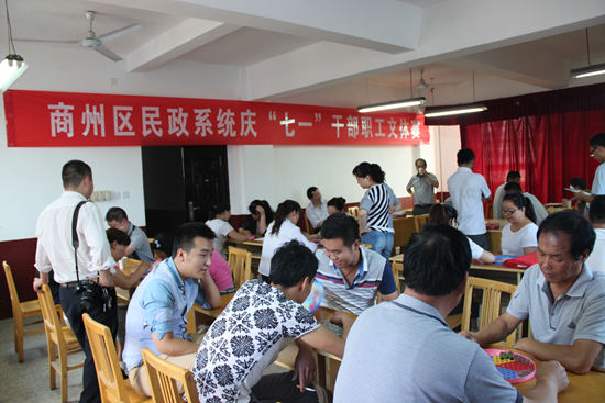 为庆祝建党94周年,推进民政系统干部职工健身运动的普及提高,激发干部职工的团队精神,增强民政系统的凝聚力、战斗力,展示干部职工团结协作、朝气蓬勃、健康向上的精神面貌,民政局总支按照简朴、精彩、热烈、圆满、安全的原则组织了民政系统干部职工庆“七一”文体赛。比赛设中国象棋、跳棋、乒乓球、羽毛球及趣味赛等项目,局机关及局属单位共80多人报名参加。