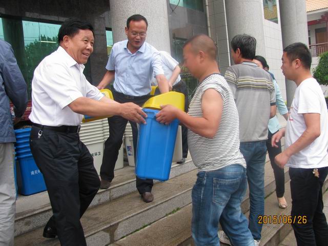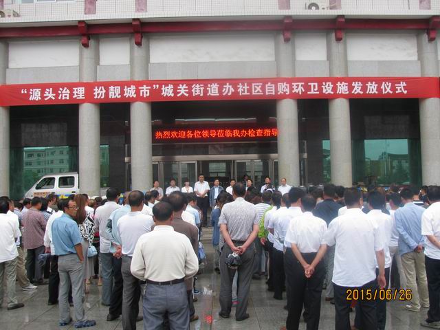 6月26日,城关街道在街办办公楼前举行社区自购环卫设施发放仪式。对地处县城核心区的3个社区13个居民小组开源节流,筹集资金11.3万元自费购置的4378个垃圾桶进行集中发放,方便群众收集垃圾,实现源头治理。