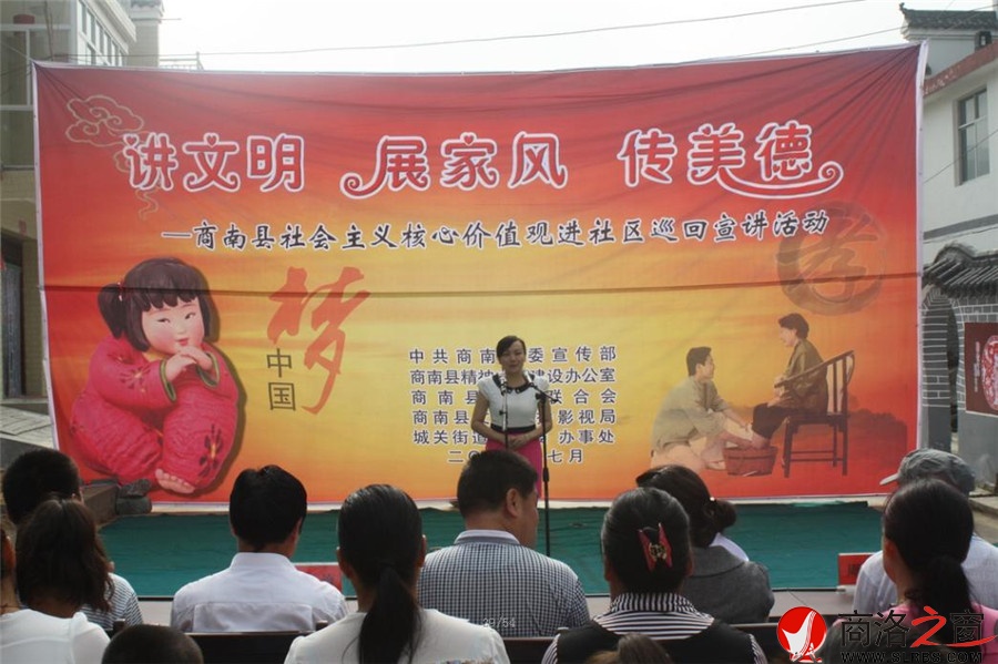 商洛之窗讯(吴丹南)连日来,由商南县委宣传部、县文明办、县妇联、县文广局联合主办“讲文明、展家风、传美德”社会主义核心价值观进社区先进事迹巡回宣讲活动陆续在城关镇捉马沟村、金丝峡镇太子坪村等地开讲。活动所到之处,群众积极参与,现场气氛热烈。