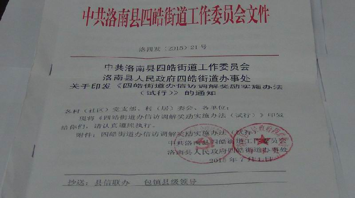 近日,为了完善各类矛盾纠纷化解工作保障机制,提高村(居)信访调解人员的工作积极性和责任感,充分发挥人民调解维护社会稳定第一道防线作用,根据《人民调解法》有关规定,洛南县四皓街道党工委、街道办事处决定对于2015年第四季度该办白川、代塬等7个村(居)成功调处的39起信访案件予以奖励。