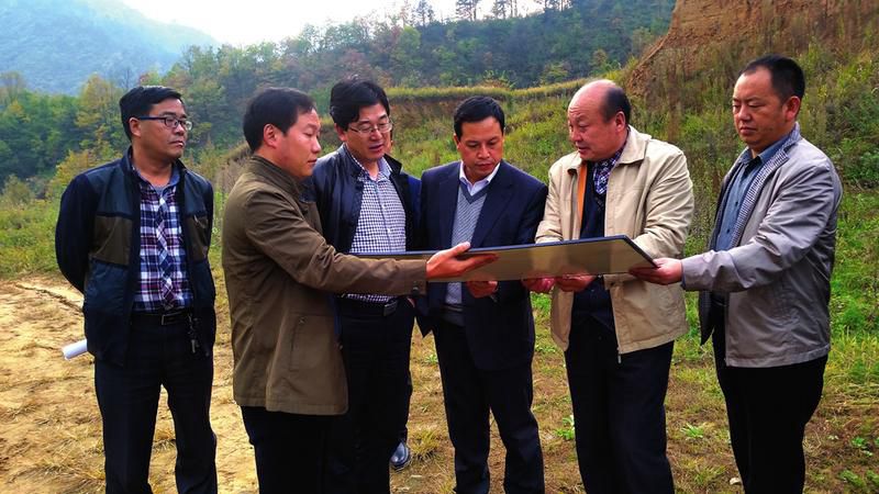 柞水县委书记陈璇(右三)和县长姚书祥(左三)研究环境