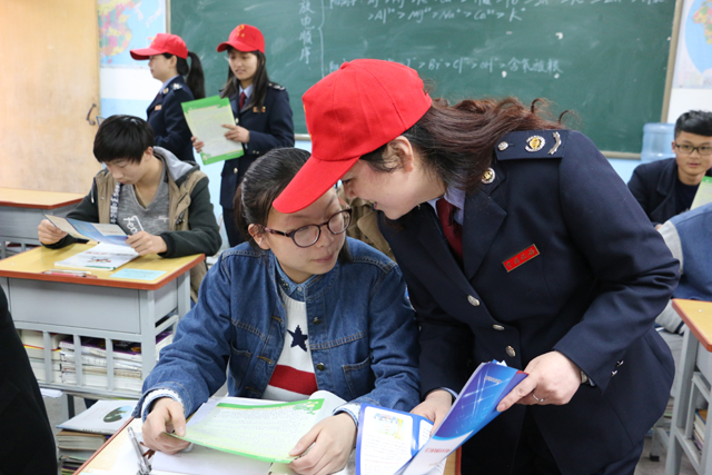 在慧源学校,几名税收宣传志愿者到该校高二(1)班,向学生们发放宣传单,并讲解有关涉税知识,回答同学们的税收咨询,在问答互动中让他们受到一次难忘的税收知识教育。