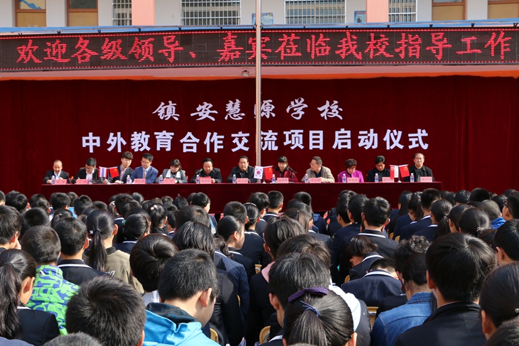 2016年3月30日上午,镇安慧源学校举行“中外教育合作交流项目启动仪式”。县委常委、宣传部长陈正斌,县副县长任淑霞、县科技和教育体育局局长毛浓权以及西北大学中韩教育中心主任沈浤、中国教师报记者部副主任、西北课改名校共同体秘书长宋永成、韩国朝鲜大学国际交流部部长奇弘相、泰国易三仓大学研究生院院长助理于挺、陕西省国际交流中心新加坡部副部长李金凤等领导、教授、专家出席了启动仪式并做讲话。