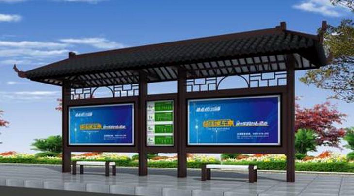 由于镇安民间艺术发达,拥有镇安花鼓、渔鼓在内丰富的民间传统文化、民间文学、民间手工艺等非物质文化遗产,因此此次候车亭设计上充分利用了传统中国建筑元素,比如顶棚采用坡屋顶造型,并设有飞檐,顶棚和灯箱之间采用了仿木雕设计,候车亭整体散发出雄浑、挺拔、飘逸的独特韵味。