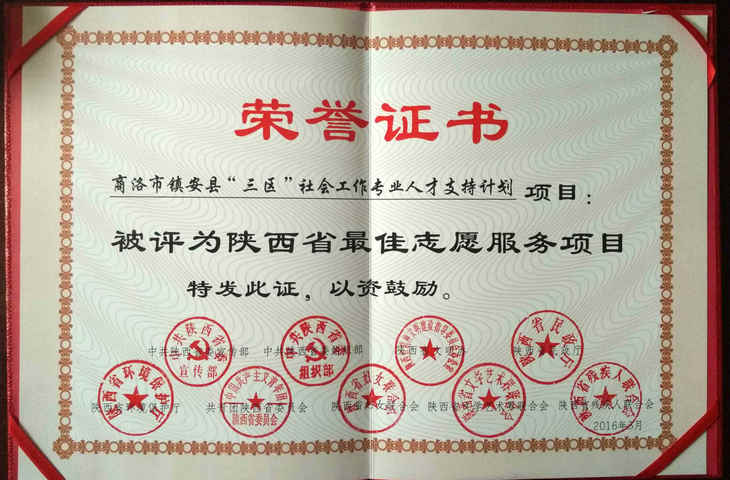 近日,由镇安朝阳志愿者协会承办的镇安县“‘三区’社会工作专业人才支持计划”志愿服务项目荣获陕西省“四个100”最佳志愿服务项目。据悉,商洛市仅有两个单位获得此荣誉。