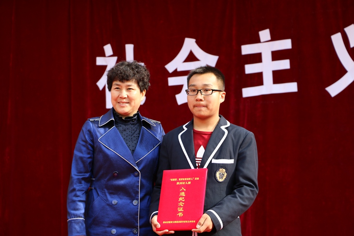 刘淑慧为入选“陕西好人榜”的慧源学校学生丁焱颁发证书
