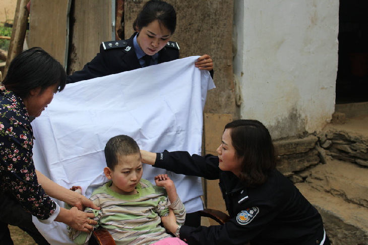 近日,永乐派出所户籍民警在对十六周岁以上人员进行人像采集过程中,发现了一名叫马澄(男,16岁,永乐镇金花村一组)的少年迟迟不来派出所办理身份证,影响了人像采集的工作进度。经过民警调查,才了解到马澄是一名患有智障和软骨病的残疾儿童,从出生到现在都不能直立行走,常年卧床不起,无法开口说话,靠年迈的爷爷、奶奶照顾。经请示所领导后同意后,永乐派出所民警汪义辉、白敏和户籍民警张玲带上相机和采集指纹的电脑上门为马澄采集照片免费办证。民警这一亲民、爱民举动受到村民的一致称赞。