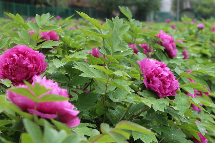 四月,当你放下繁忙的工作,在这牡丹园盛开的雨天驻足、观赏、遐思……有上千株牡丹花次第开放,红的,粉的,白的,一簇接一簇的欣然盛开,株株朵大如掌,争奇斗艳、清香四溢。而有的牡丹含苞待放,形态、神韵、色彩在雨中更像是一位待嫁出阁的娇羞姑娘,雨珠滴落在花蕊间,像姑娘那脖颈间的珍珠,美丽典雅一览无余。