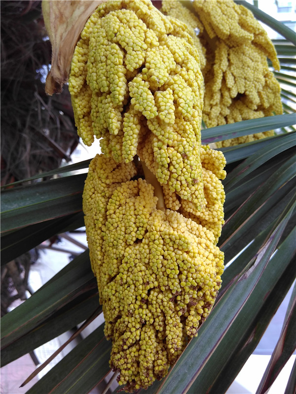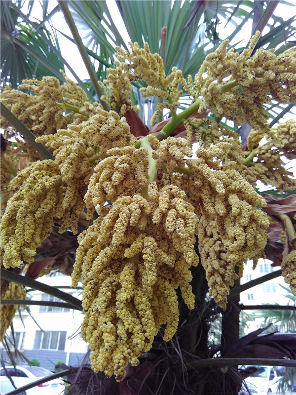 商洛市商州区江南小区西片区就栽植了大量的棕树。随着气温的升高,这些棕树开花了,树冠上都长出了黄灿灿的花絮,小花蕾密密麻麻挤挤掐掐如谷穗、如高梁穗,淡黄色,肉穗花序,排列成圆锥花序,甚为壮观。棕树在北方也可以开花,每次路过,都忍不住想去看一下。4月19日,记者再次路过时,拍了几张照片。
