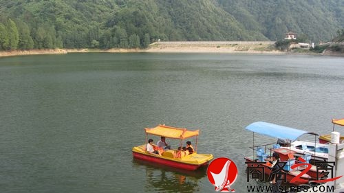 碧波荡漾,游客们在湖面上悠然自得。远处,湖坝宛如峡关险隘。