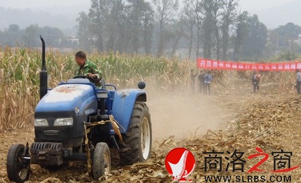 笔者在丹凤县商镇看到,一大一小两辆拖拉机带着碎草机和旋耕机下地耕田,旁边吸引了许多群众驻足观看。拖拉机拖着碎草机几个来回,不一会儿就将两亩多地的玉米秸秆扑倒粉碎,均匀的平铺在地面上,随后旋耕机将地翻平整,整个过程用时不到30分钟。