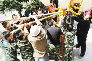 “娃跟着妈妈在广场路玩耍,不知怎么就钻进了这个路灯杆,但却被卡在里面出不来了。”市民王大妈指着路灯杆告诉记者。在现场,记者看到小宣宣的头被卡在三根黄色钢柱组成的路灯杆内,不停啼哭,路灯杆四周围满了10余名消防人员和一些好心人。这种路灯杆每一根都有碗口粗细,相当结实。