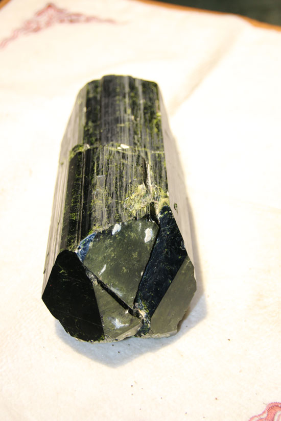 笔者在潘某家看到,这块疑似绿帘石重2233.2克、长21厘米、直径7.5厘米,形状为不太规则的六棱柱形,在灯光照射下可见深绿色光泽,石里有星星点点的绿色花纹。