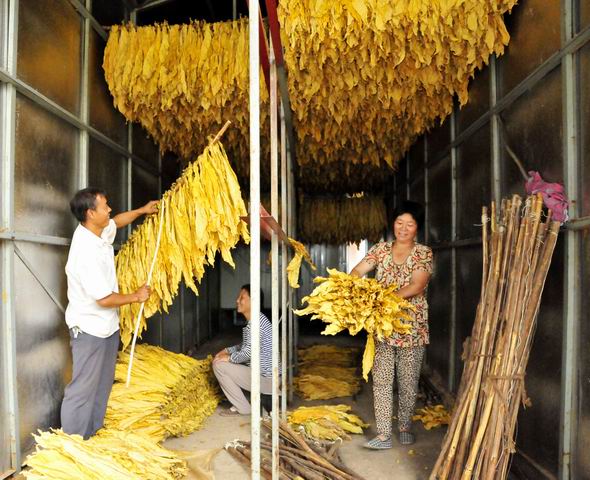8月19日,石坡镇李河村烟农陈德焕正在整理烘烤好的黄灿灿的烟叶,脸上洋溢着欢快的笑容。陈德焕是洛南县有名的烤烟大户,经过多年的经验积累,他种植烤烟的规模不断扩大,今年共流转土地发展烤烟35亩,收入可达13万余元。 (程 刚摄)