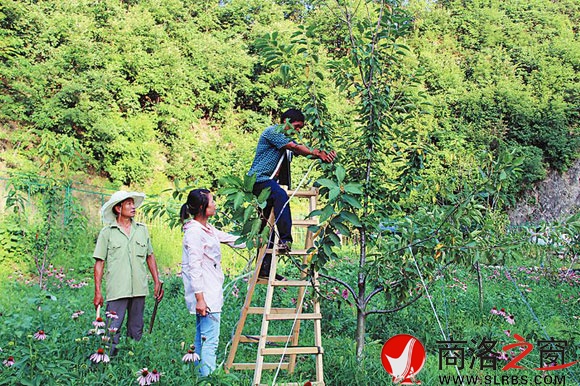 7月28日,镇安县青铜关镇丰收村贫困户刘高胜等正在为樱桃树整株定型,以期来年增产增收。去年以来,该村创新开展了“支部+合作社+党员示范户+贫困户”的党建模式,由支部5名支委分别领办5个合作社(公司),带动13名党员示范户包抓52户贫困户脱贫,引领助推贫困户脱贫致富。(记者 赵有良 王聪 摄)