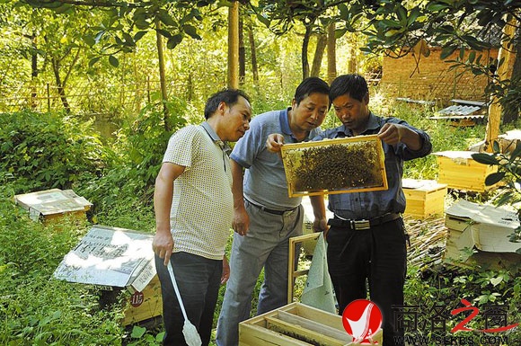 近日,洛南县委组织部驻景村镇韩湾村扶贫工作队党员干部在金灿湾养蜂专业合作社查看蜜蜂产蜜情况。洛南县不断推动党建领航和精准扶贫深度融合,大力实施“双二三”增收致富工程,支持和鼓励“每个农户参加一两个专业合作社,发展一两项主导产业”,夯实“五个一批”脱贫基础。全县共建成170多个专业合作社,带动上万户贫困户户均增收8000多元。(张强民 董磊 摄)