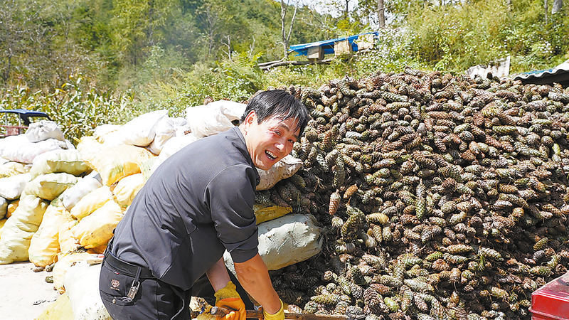 刘由成今年新购置了脱粒机,将收购来的松塔直接加工成松子再外销,不仅提升了产品附加值,还增加了利润,也极大地降低了运输成本。仅靠收购、加工松塔这一项,他和妻子一年的收入就达10多万元。