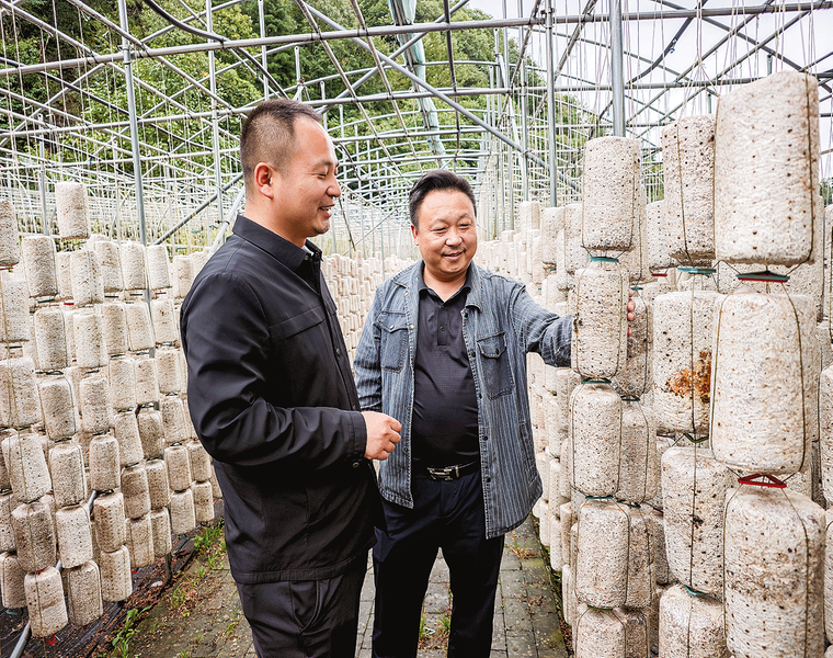 9月19日,西华村党支部书记石立柱(右)在木耳基地查看木耳生长情况。