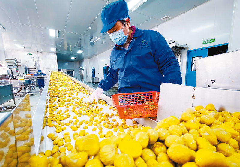 11月27日,在陕西合曼农业科技有限公司板栗产品加工生产线上,工人正在进行板栗清洗、切口、分拣、降温等工序。镇安县是全国板栗主产区之一,主推品种为镇安1号,今年种植面积60多万亩,收获板栗1.1万吨,总产值可达1.4亿元。 (本报通讯员 倪方海 摄)