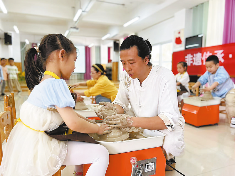“非遗进校园”活动中,黄冲在镇安县第二幼儿园带领小朋友体验陶艺制作。(资料照片)